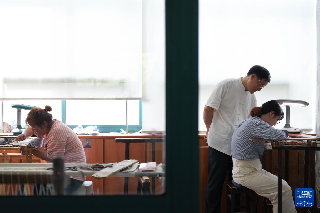 6月6日,在东台嘉丽发绣厂,东台发绣传承人陈伯余指导徒弟装裱一幅双面发绣作品。