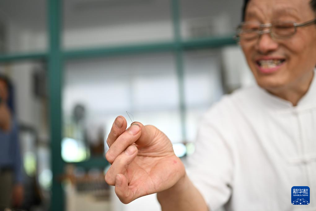 6月6日,在东台嘉丽发绣厂,东台发绣传承人陈伯余展示发绣所用的“12号针”。