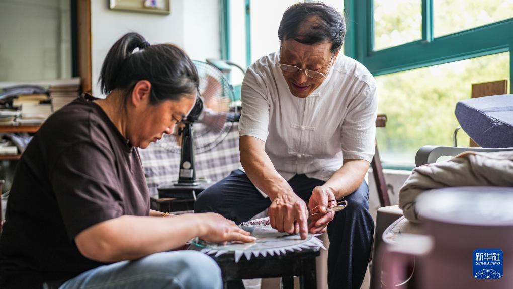 6月6日,在东台嘉丽发绣厂,东台发绣传承人陈伯余指导徒弟绣制发绣作品。