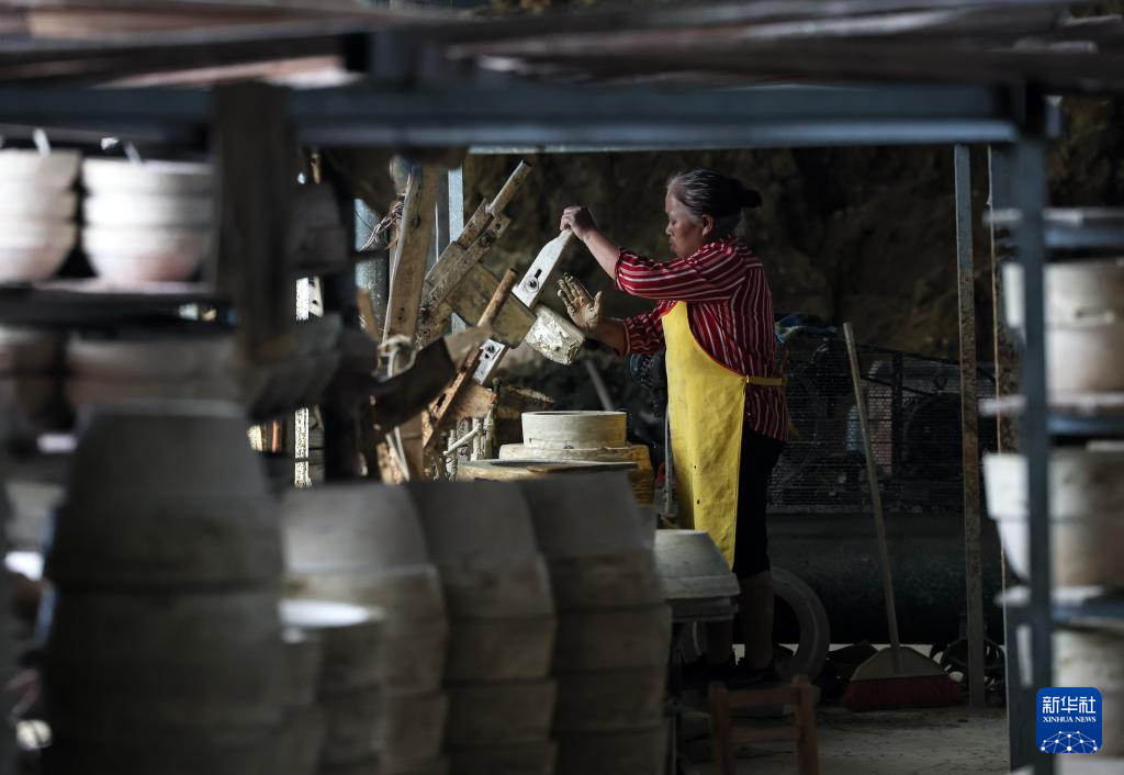 6月17日,制陶师傅方亮生在湖南省郴州市桂东县普乐镇陶瓷作坊制作陶器。