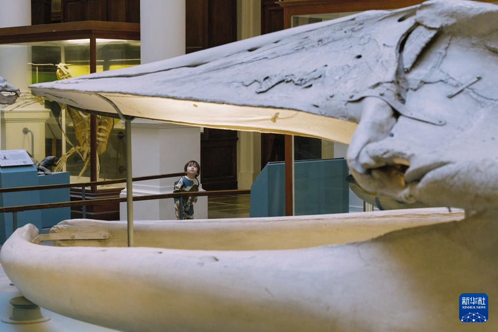 6月20日,一名小朋友在阿根廷拉普拉塔博物馆内参观蓝鲸头骨。