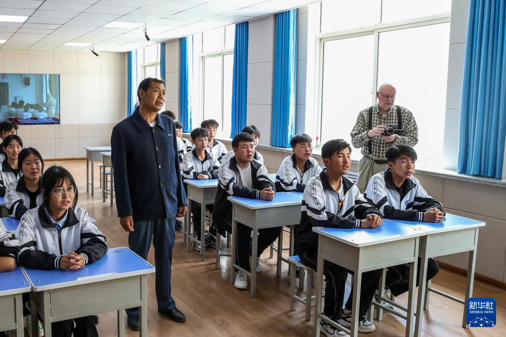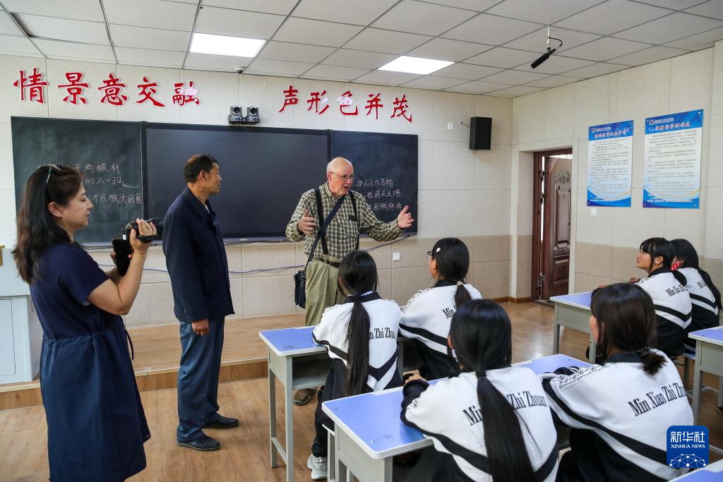 在甘肃省定西市岷县职业中等专业学校的“花儿进校园”课堂上,高文厚为学生讲述自己对于“花儿”的理解(6月13日摄)。