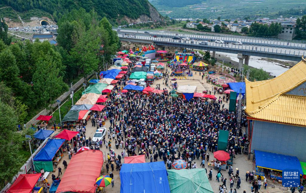 6月16日,在甘肃省定西市岷县西寨镇,当地群众参加“大庙滩花儿会”(无人机照片)。