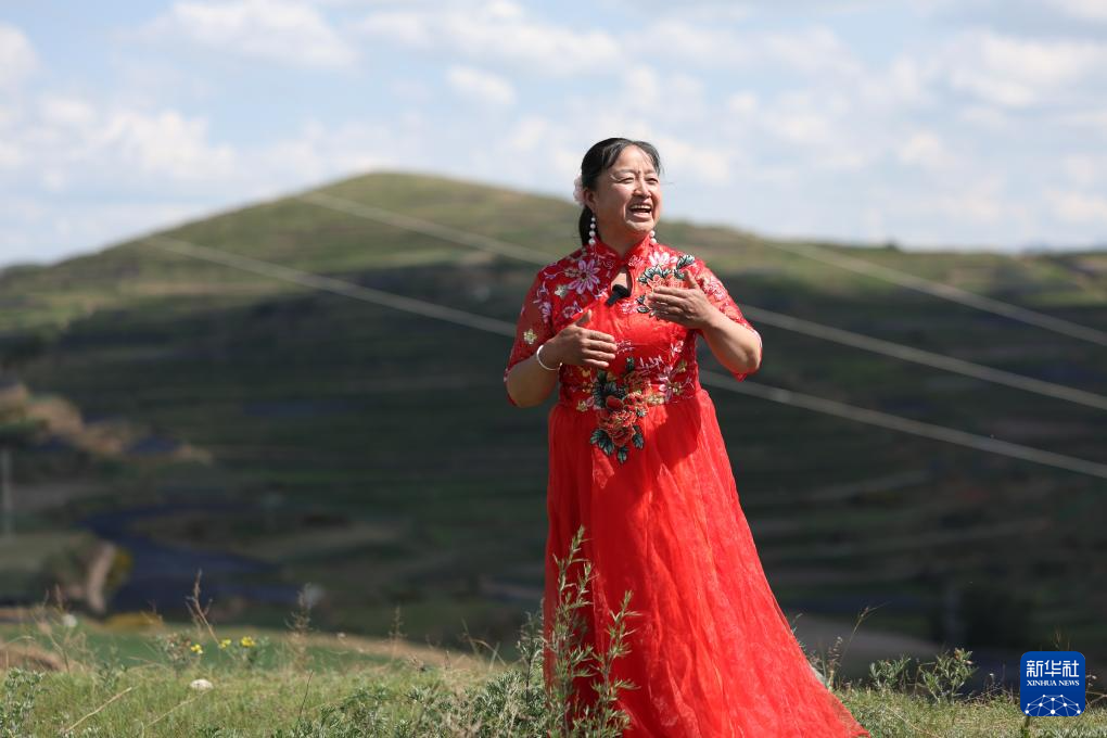 “花儿”歌手包小菊在甘肃省定西市岷县二郎山上唱“花儿”(6月11日摄)。