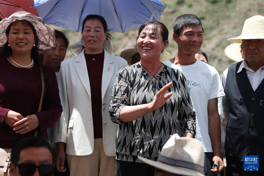 在甘肃省定西市岷县洮河边的一场“花儿会”上,“花儿”歌手蒲次菊(中)在唱“花儿”(6月10日摄)。