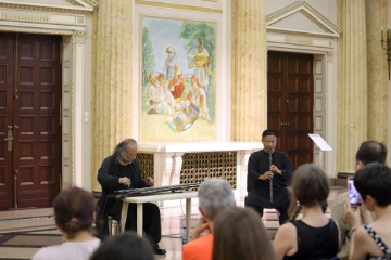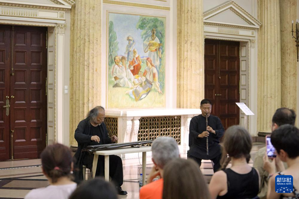 6月26日,在罗马尼亚布加勒斯特,国家级非物质文化遗产古琴艺术代表性传承人王鹏(后左)、笛箫演奏家刘小冈(后右)在中国古琴音乐赏析会上表演。新华社发(克里斯泰尔摄)