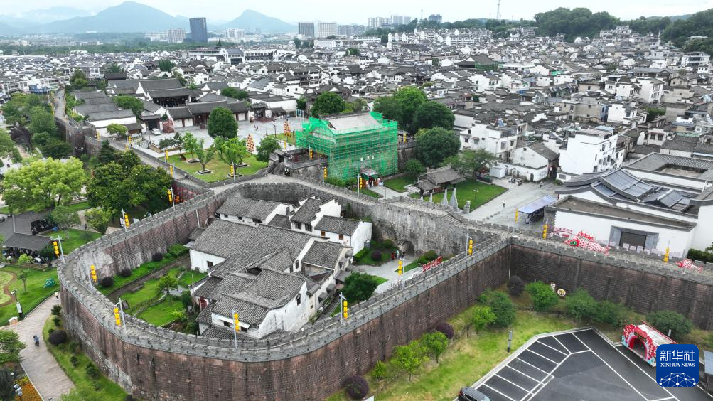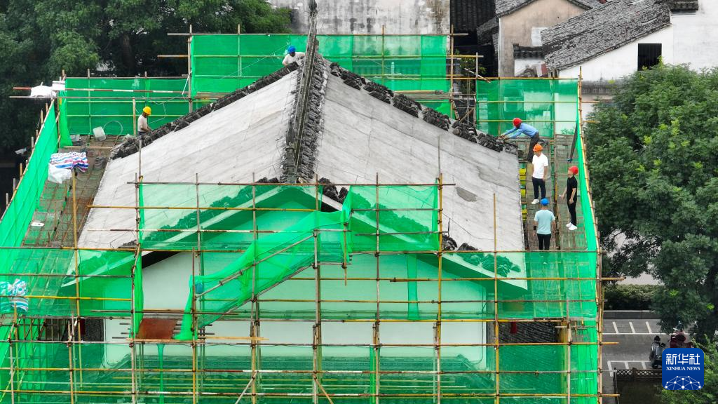 6月19日拍摄的歙县徽州古城南谯楼保养维护工程现场(无人机照片)。
