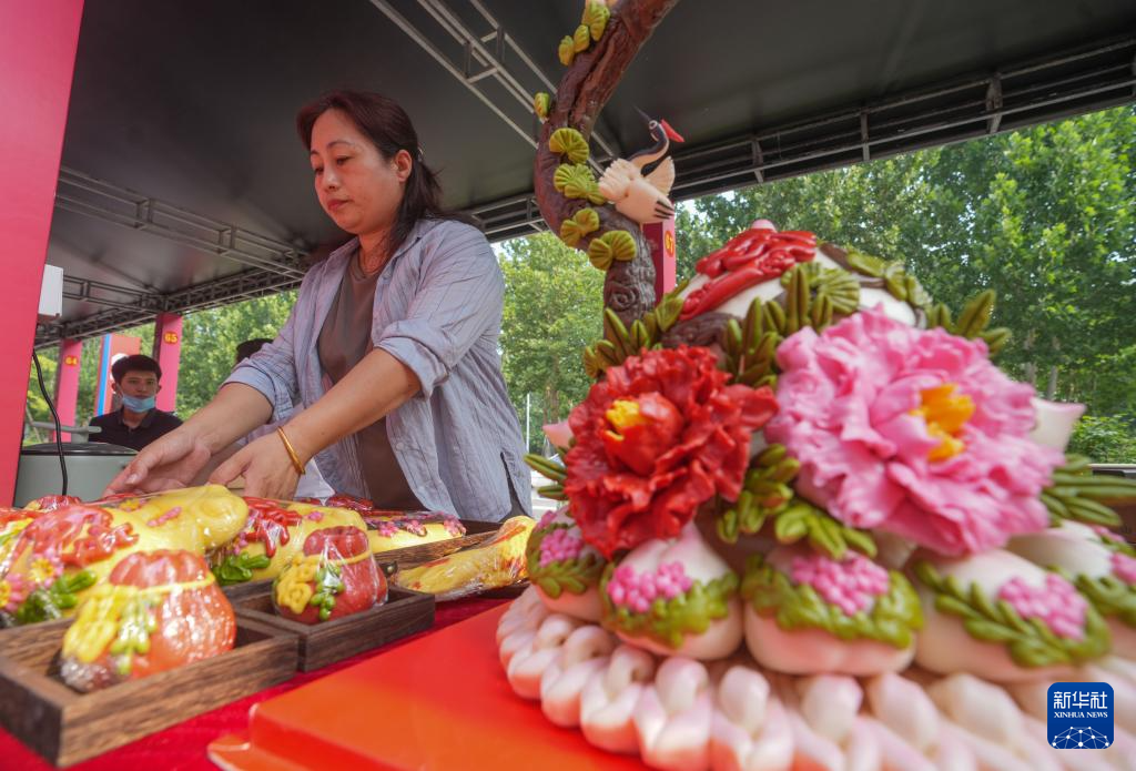 6月28日,“黄河大集”田园丰收市集的一位摊主在整理花馍。