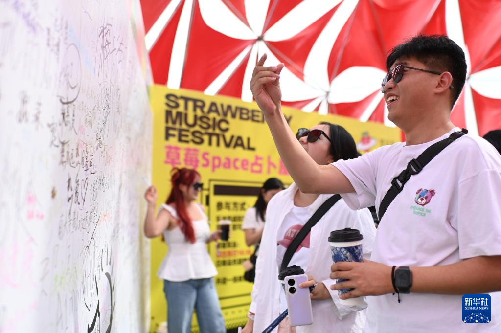 7月12日,在2025新疆超级草莓音乐节现场,人们参加签名墙活动。