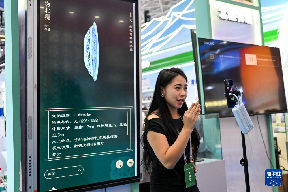 7月17日,一名主播在第九届内蒙古自治区文化产业博览交易会现场介绍文物信息。