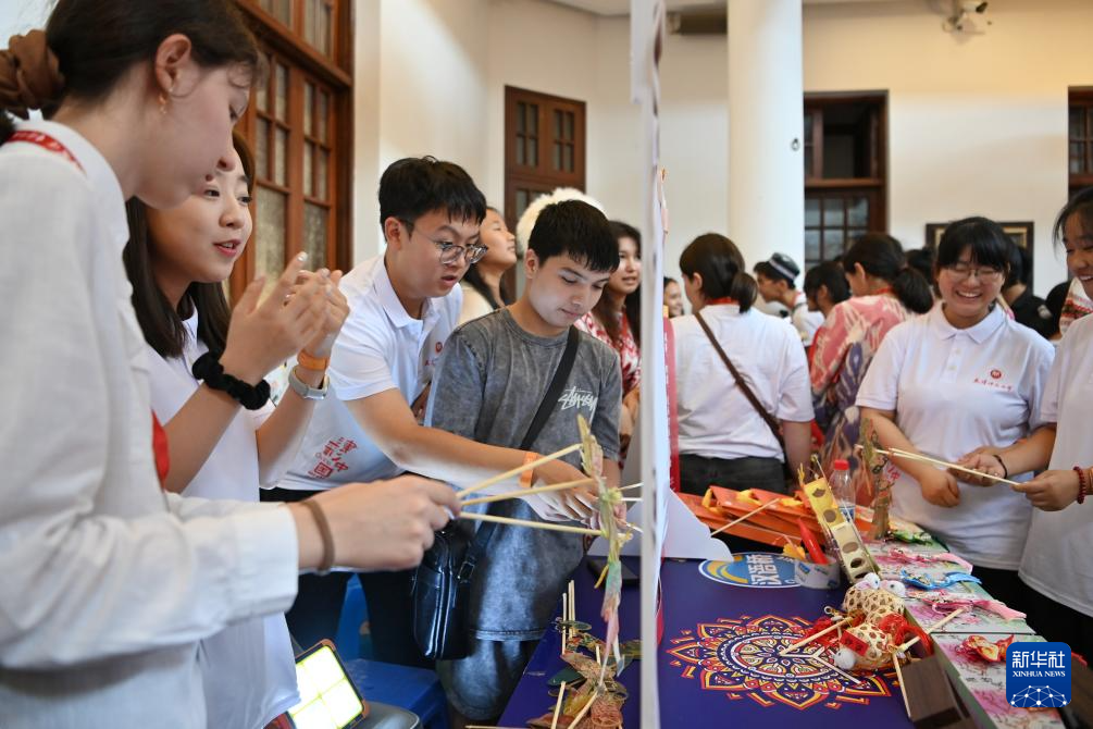 8月6日,上合国家青年学生在体验皮影戏。