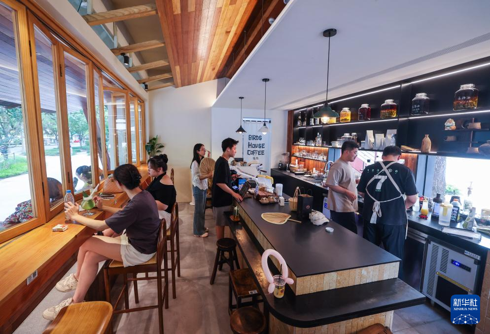 8月7日,游客在嘉创湾花园式产业园区的咖啡店喝咖啡。
