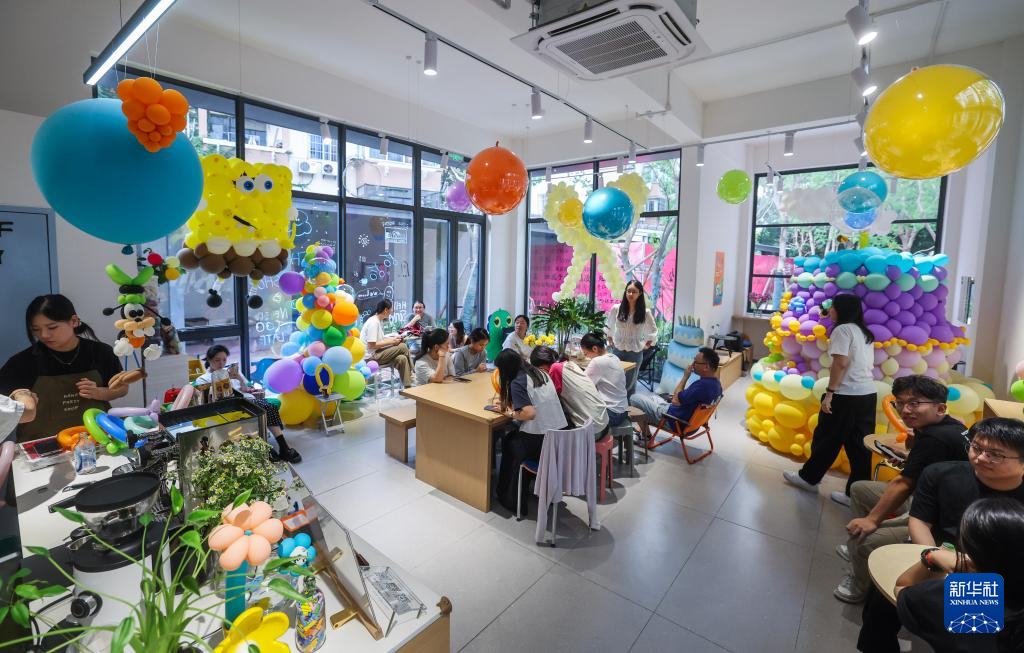 8月7日,一些年轻人在嘉创湾花园式产业园区的气球派对商店内开展团建活动。