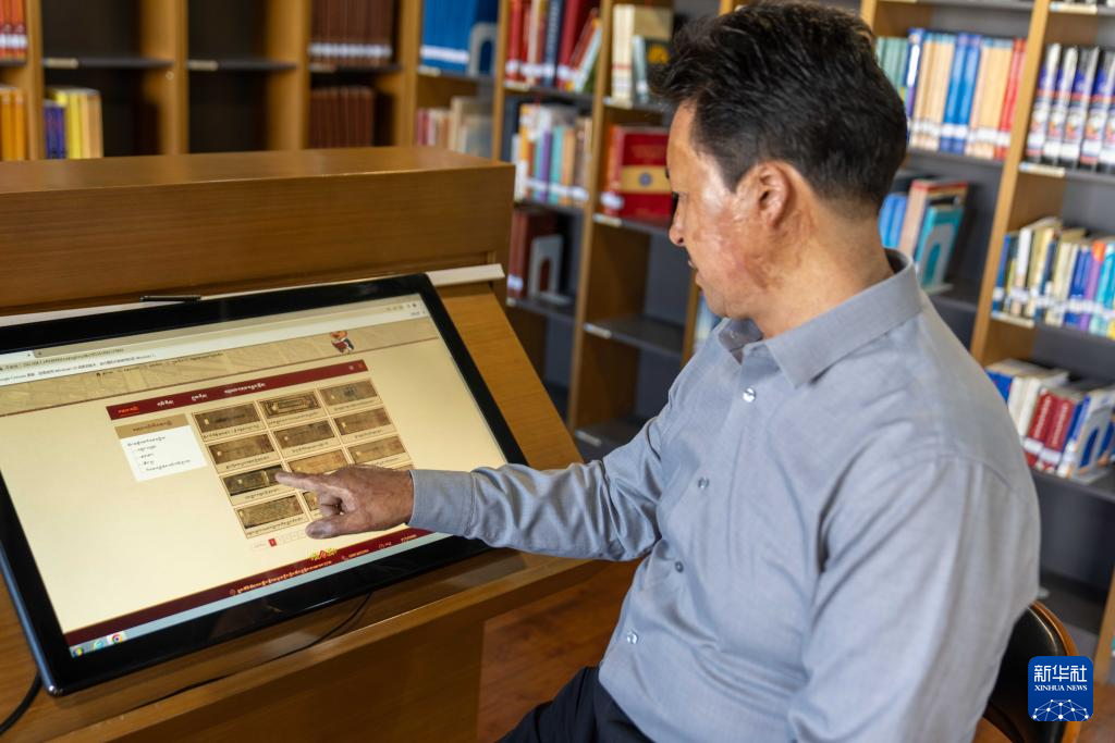 8月13日,西藏自治区图书馆副馆长边巴次仁在介绍数据库中的藏文古籍。