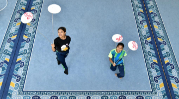 8月21日,一位小朋友在第七届山西文化产业博览交易会上通过VR设备游览晋祠。