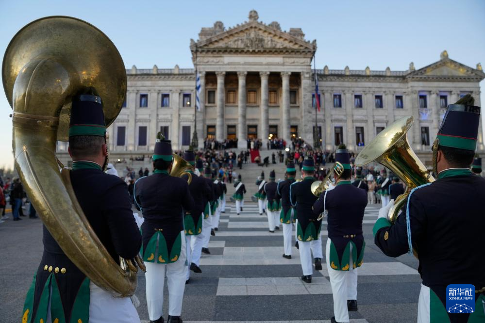 8月25日,乌拉圭在位于首都蒙得维的亚的立法宫举行音乐会,纪念宣告独立200周年。音乐会后,军乐队在立法宫外演奏。