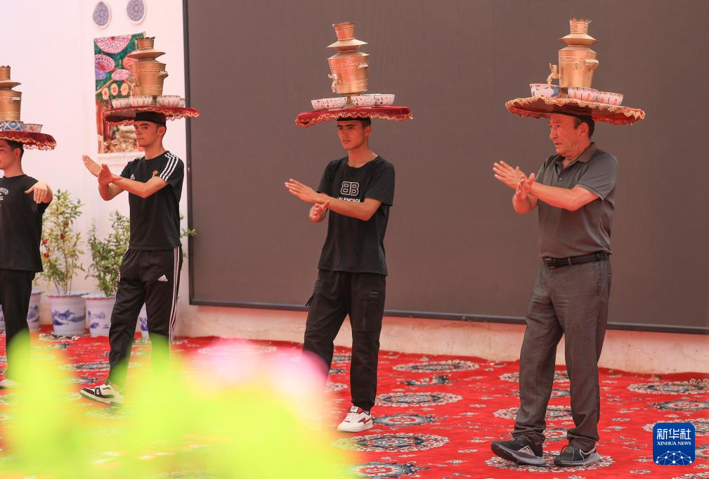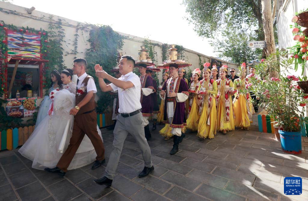 7月22日,在新疆库车市的龟兹小巷,表演萨玛瓦尔舞的演员参与当地的一场婚礼活动。