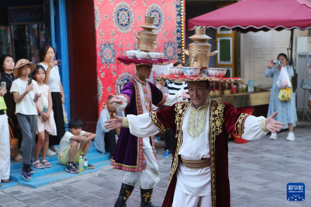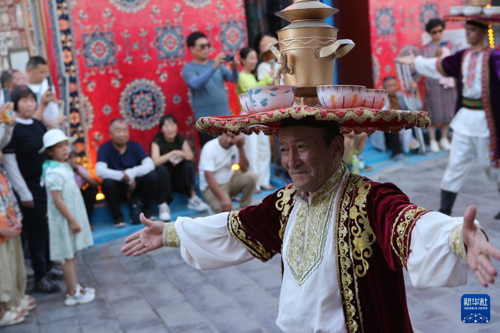 7月22日,在新疆库车市的龟兹小巷,演员表演顶碗舞。