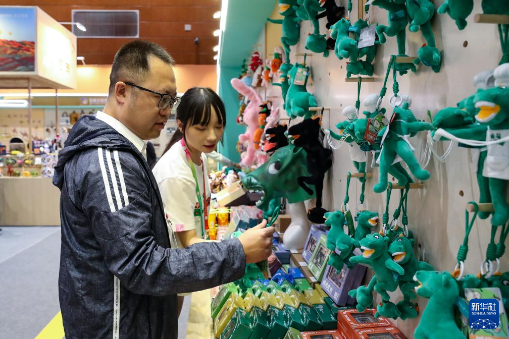 9月21日,与会嘉宾在第八届丝绸之路(敦煌)国际文化博览会上选购非遗文创产品。