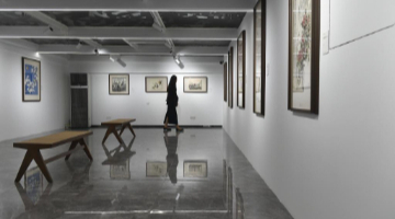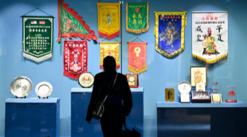 9月27日,在西宁市圣源地毯集团有限公司生产车间,一名操作工从展示的藏毯前走过。
