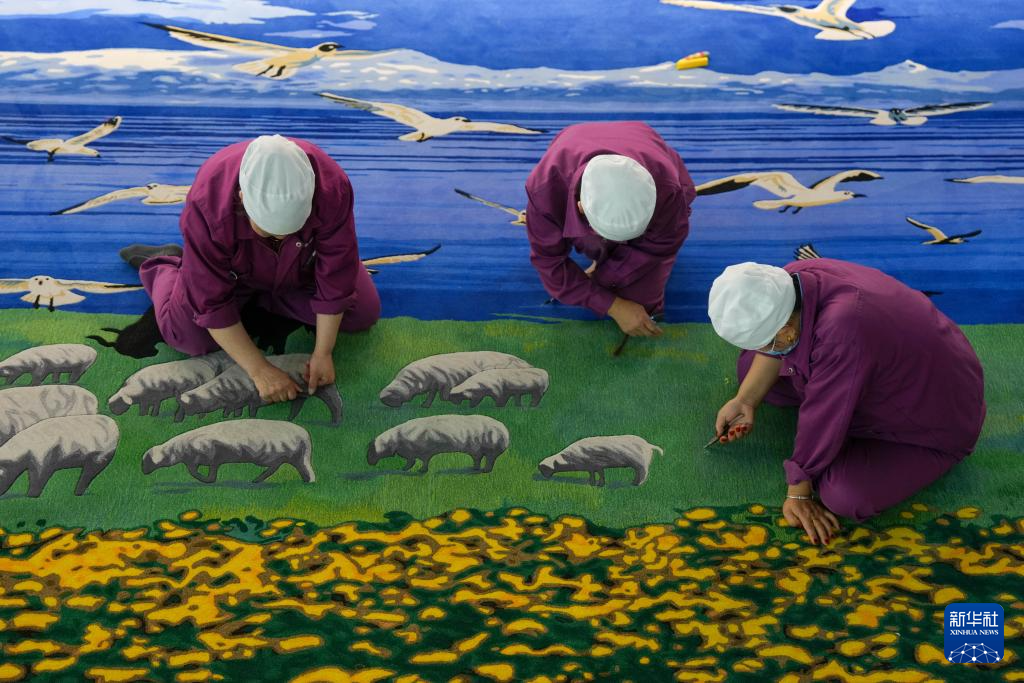 9月27日,在西宁市圣源地毯集团有限公司生产车间,三名操作工在制作藏毯。