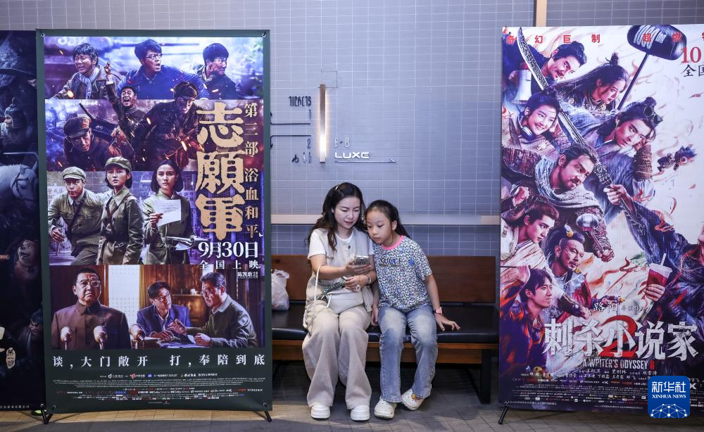 10月8日,在福建省厦门市思明区一家影城,观影市民从电影海报前走过。