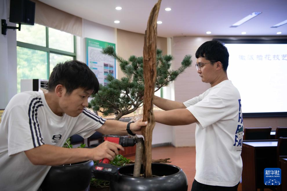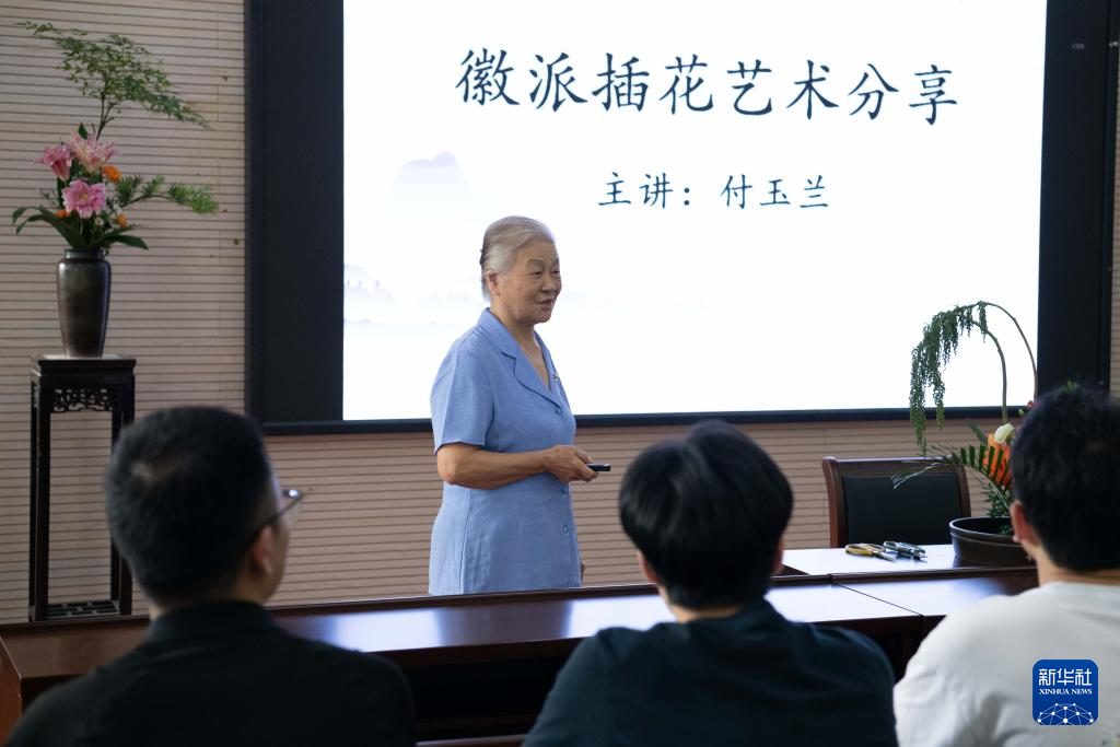 9月30日,在安徽农业大学林学与园林学院徽派插花艺术传承基地,付玉兰(后)为在校师生讲授徽派插花艺术的相关知识。