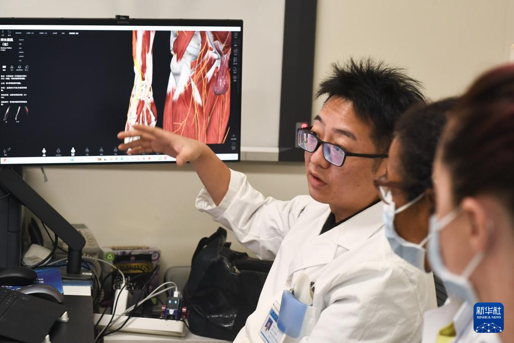 10月22日,在南京鼓楼医院,中医科医生为来自不同国家的见习医生讲解中医术。