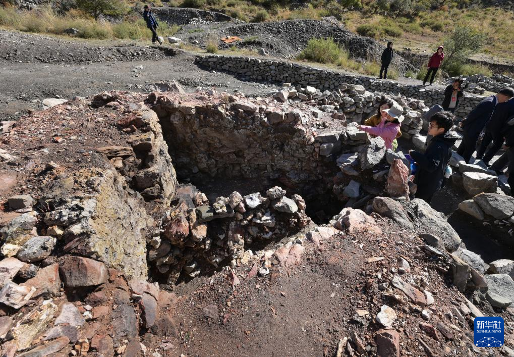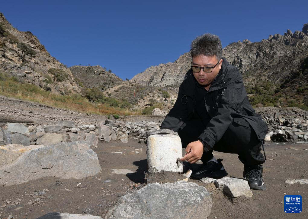 考古学家们在对苏峪口瓷窑址2025年度发掘区出土的一处石英加工遗迹进行考察(10月13日摄)。