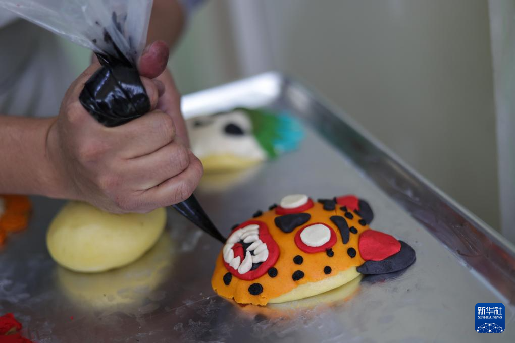 10月27日,在墨西哥首都墨西哥城的一家面包房,面包师制作“亡灵面包”。