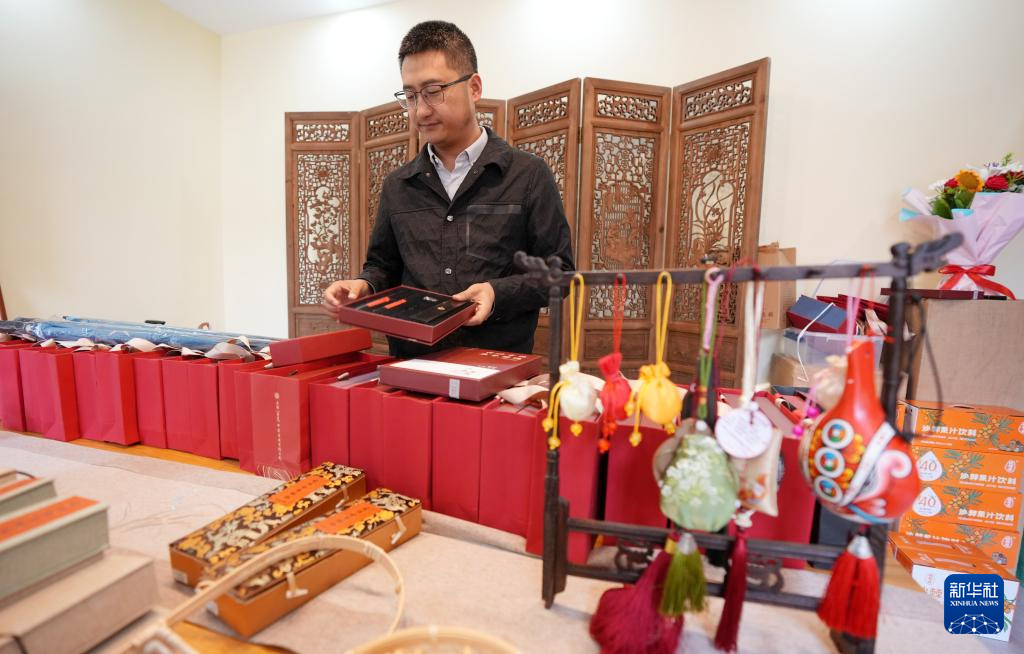 返乡创业青年石磊在隆德县城关镇杨家店村向游客介绍文创产品(10月26日摄)。
