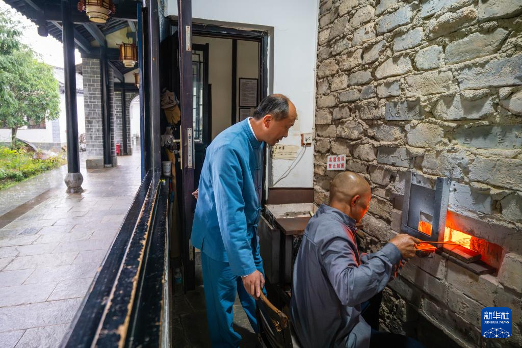 走进位于保山市隆阳区金鸡乡的永子文化园,上千度的窑炉昼夜不息。永子第十二代传人、国家级非遗传承人李国伟坐于炉前,目光如炬。他右手持特制滴棒,从容蘸裹熔化的玉料,将其轻巧滴沥在左手所持的厚铁板上。在一点一收间,一枚枚莹润细腻的永子从火红的液态逐渐凝固成扁圆的固态,在铁板上整齐排列。“这看似机械、快速的动作,至少需要六七年的苦练才能达到心手合一,”李国伟说,“因为滴制永子没有模具,大小薄厚全凭经验和手感。”40多度的室温环境下,火光照映在李国伟脸上,汗水浸湿衣衫,他却气定神闲,一气呵成,几分钟就滴制出一盘大小、薄厚统一的棋子。