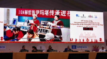12月11日,在印度新德里举行的联合国教科文组织保护非物质文化遗产政府间委员会第20届常会上,大屏幕上播放中国“赫哲族伊玛堪”保护成果。