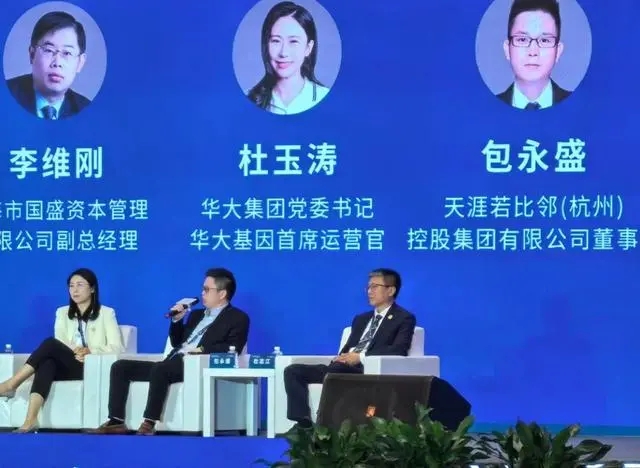 天涯若比邻(杭州)控股集团有限公司董事长包永盛(右二)在2023中国企业家太阳岛年会主论坛“思客对话”环节发言