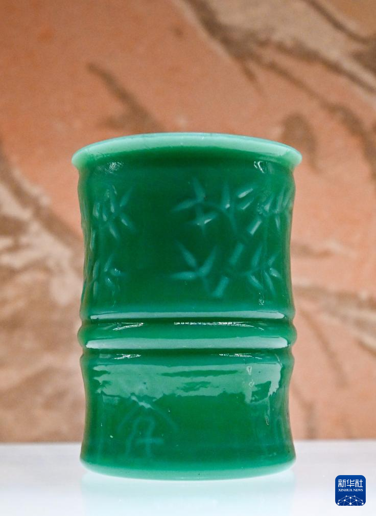 这是展出的淄博陶瓷琉璃博物馆藏清代碧色琉璃笔筒(6月10日摄)。