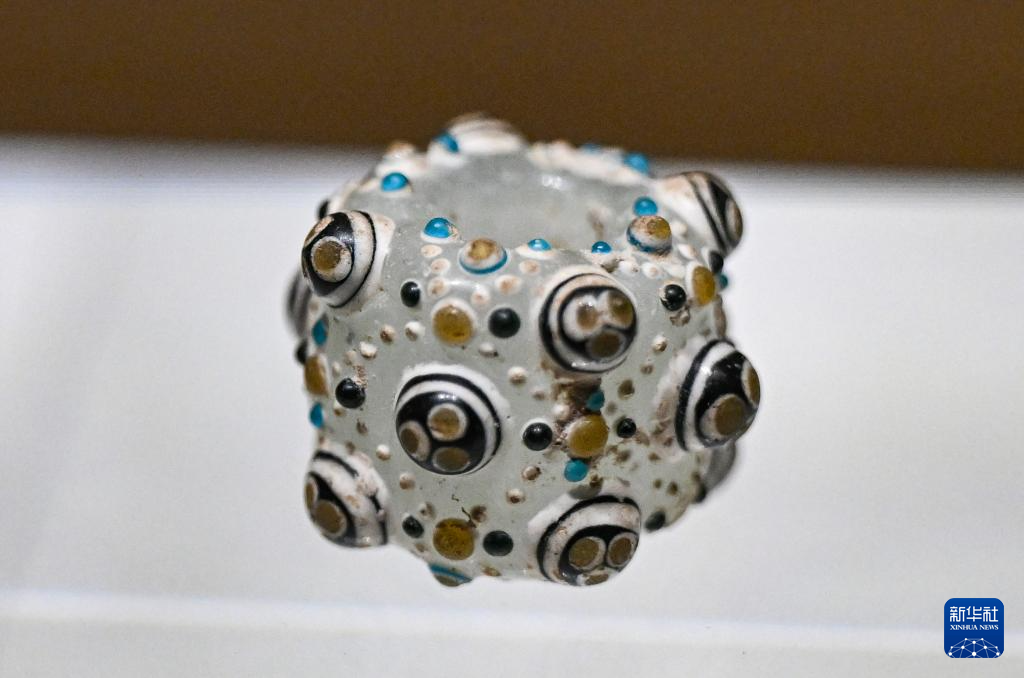 这是展出的淄博市博物馆藏战国琉璃珠(6月10日摄)。