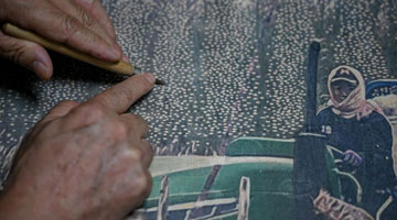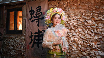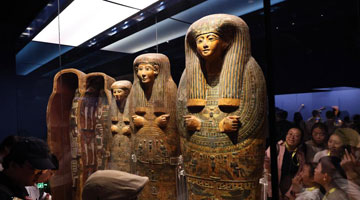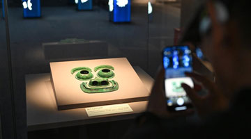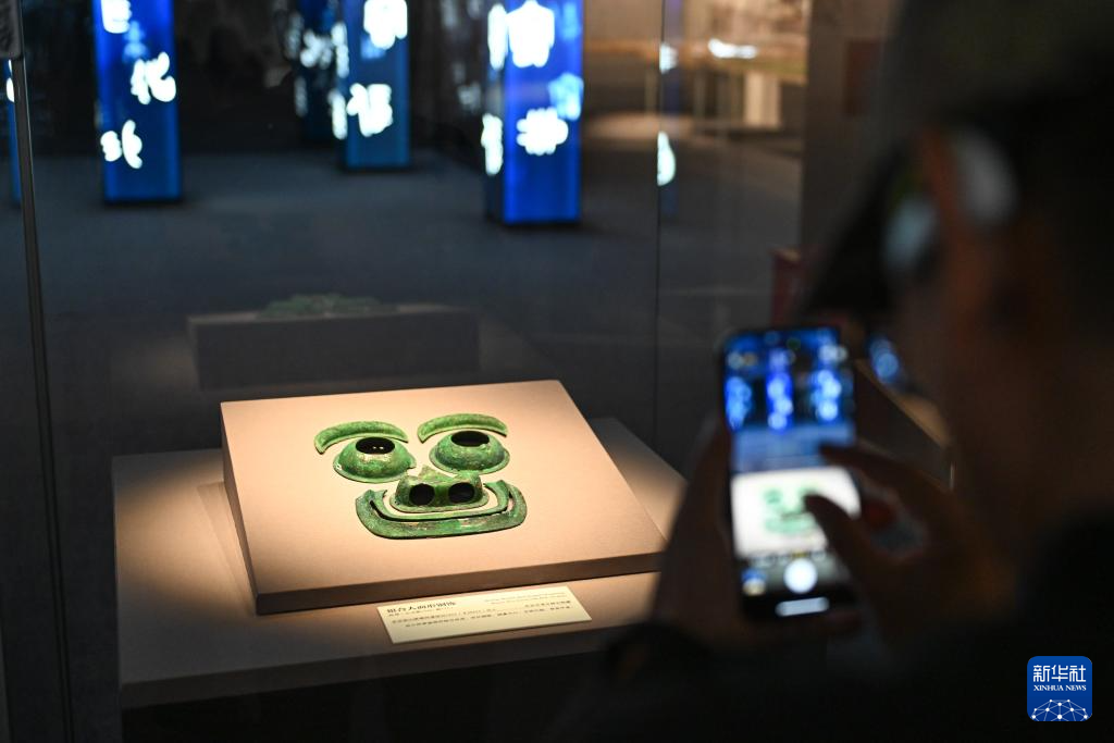 这是8月28日拍摄的展览中的组合人面形铜饰。