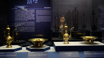 琉璃河遗址出土文物克盉(左)、克罍在展览中同时展出(8月28日摄)。