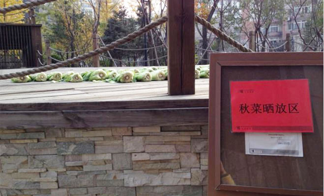记者注意到,世茂五里河小区院内并不是“一菜不见”,但晾晒的秋菜的确比其他小区规范很。在小区一处活动场地外,贴着“秋菜晒放区”告示,社区物业为不影响小区的整体环境,专门为业主特别开设区域。(新华房产调查记者 温妍)