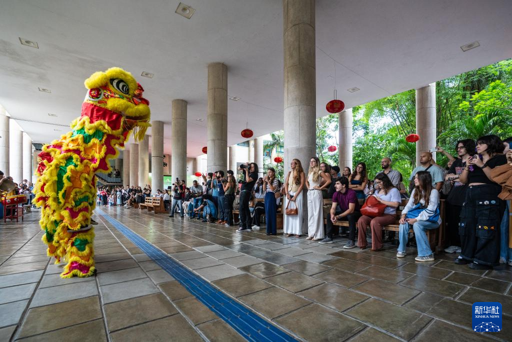 4月15日,在巴西里约热内卢天主教大学举办的“国际中文日”庆祝活动上,人们观看舞狮表演。