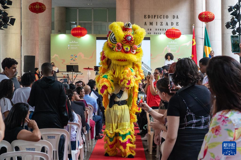 4月15日,在巴西里约热内卢天主教大学,舞狮队在“国际中文日”庆祝活动上表演。