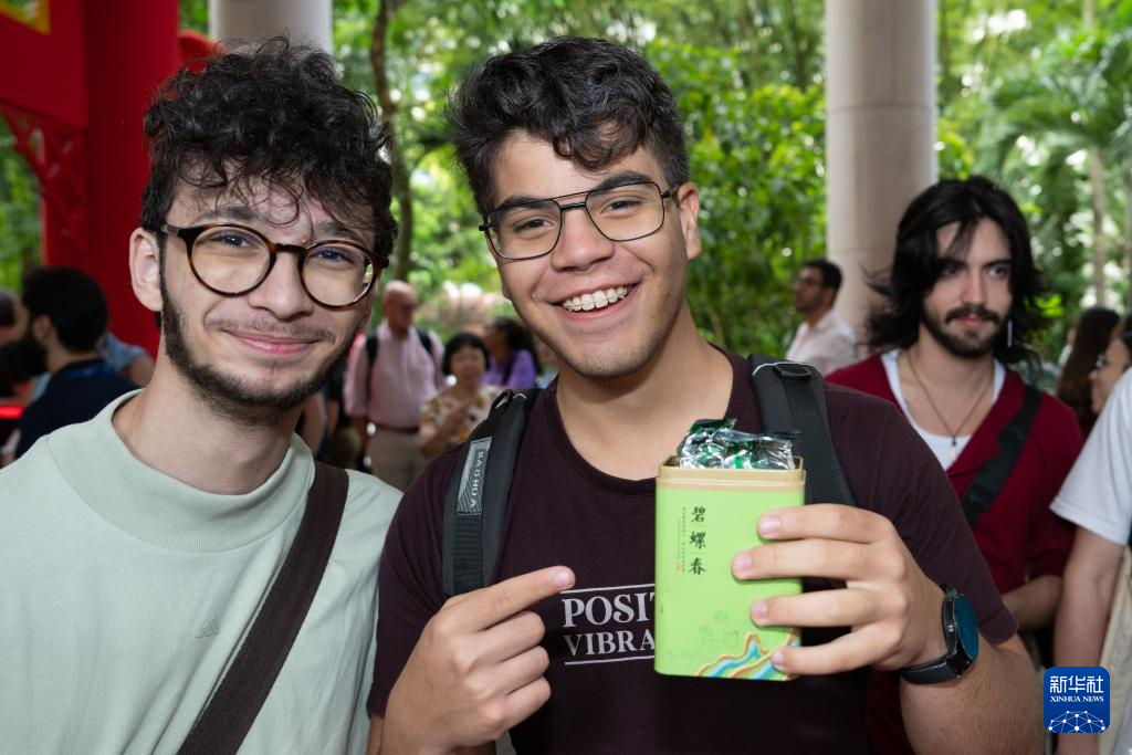 4月15日,在巴西里约热内卢天主教大学举办的“国际中文日”庆祝活动上,两名学生称赞中国茶叶。