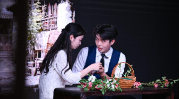 4月15日,在云冈石窟,身着传统服装的演员和游客互动。