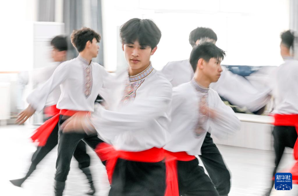 4月14日,罗昊(左)和同学在舞蹈学院专业技能课教室里排练群舞《阳光下的麦盖提》。