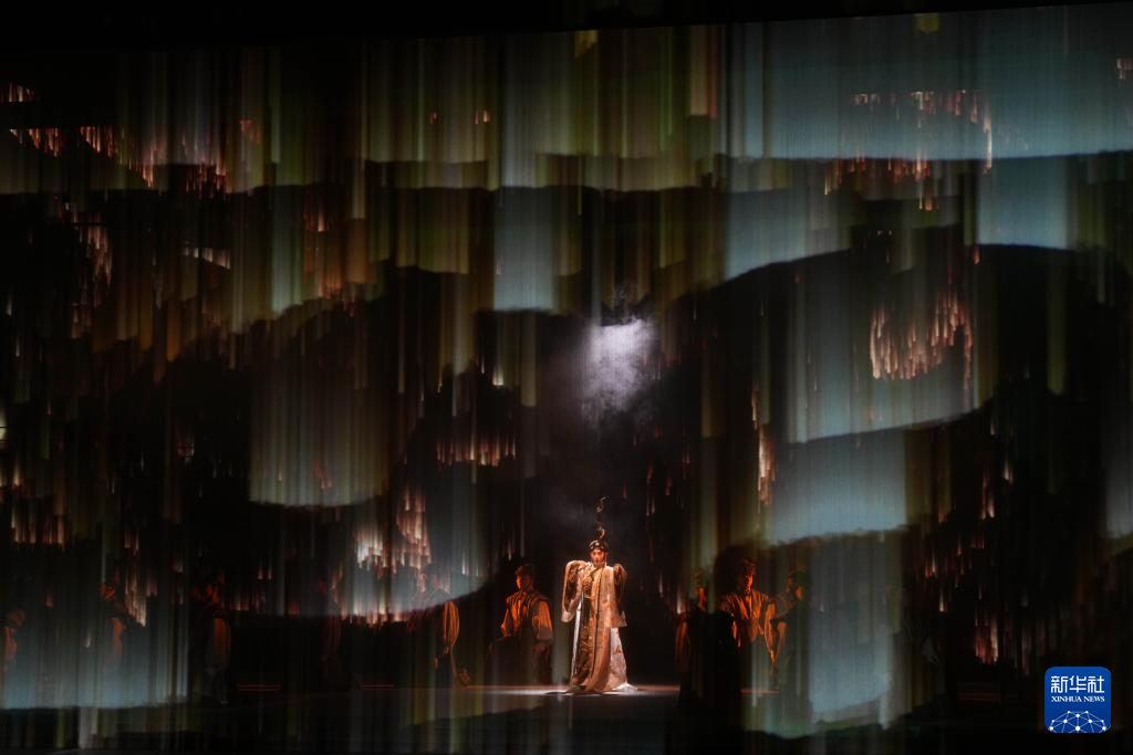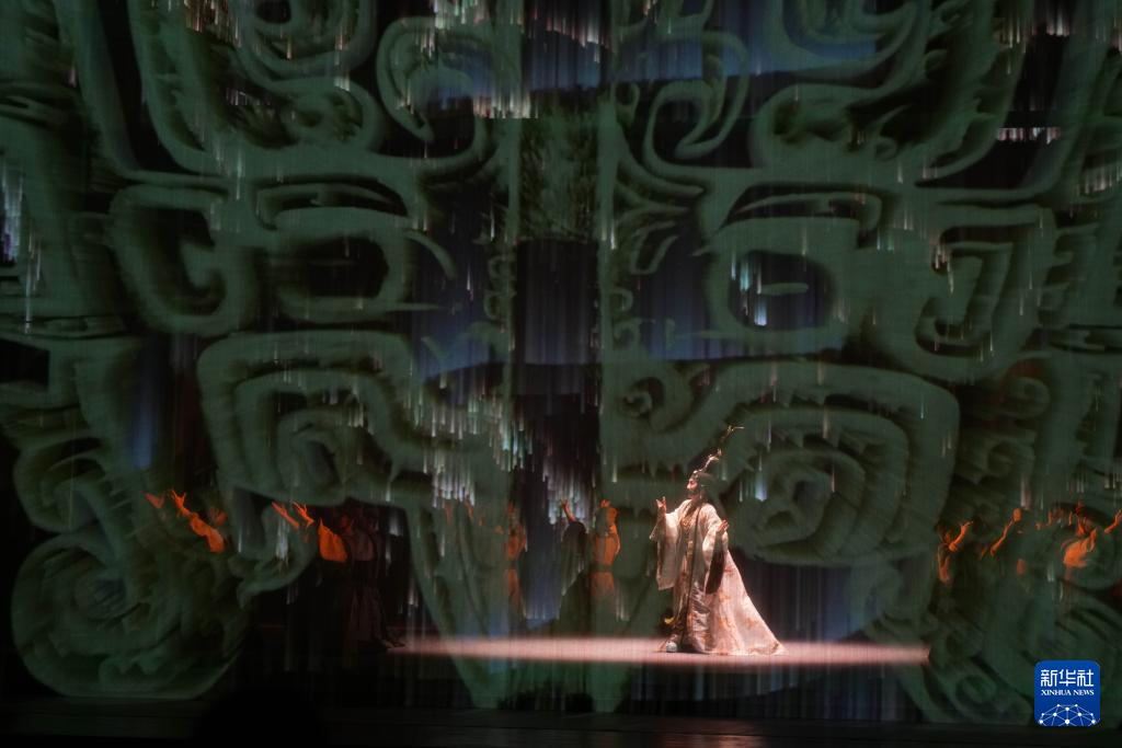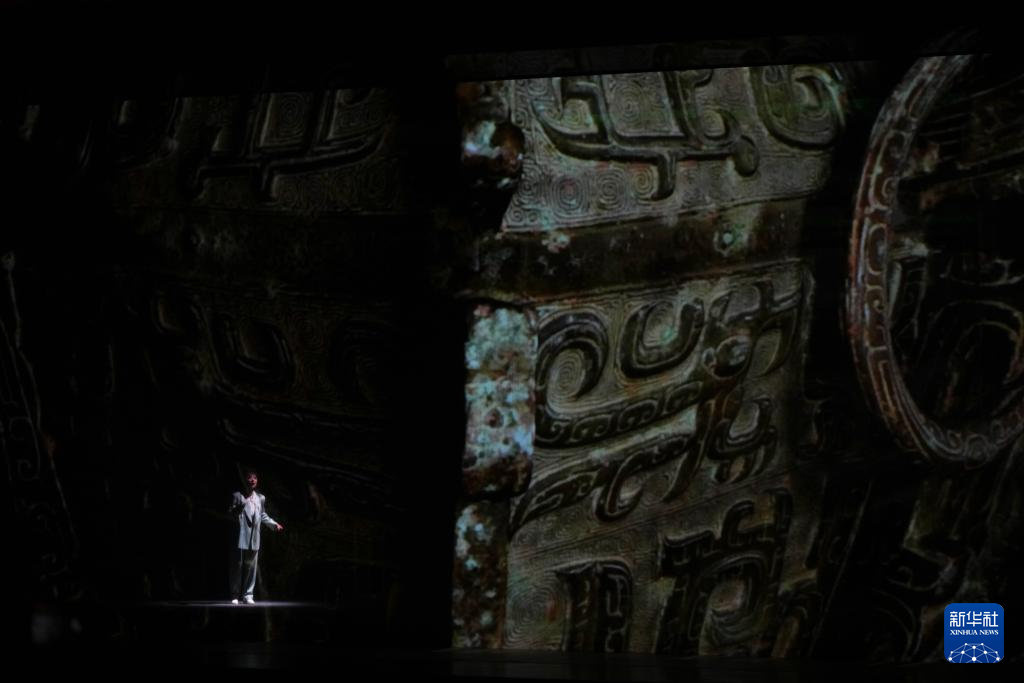 4月23日,演员在湖南大剧院演出新编京剧《皿方罍》,皿方罍的部分纹饰被投影在纱幕上。
