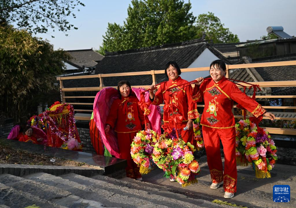 4月27日在运河·盂城驿街区拍摄的非遗表演队伍。