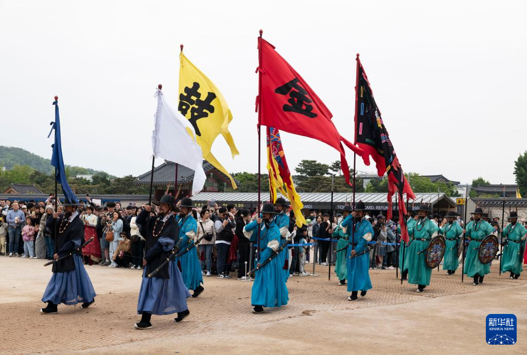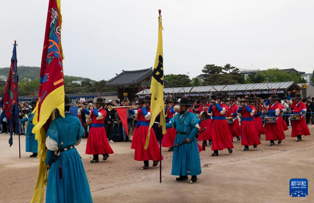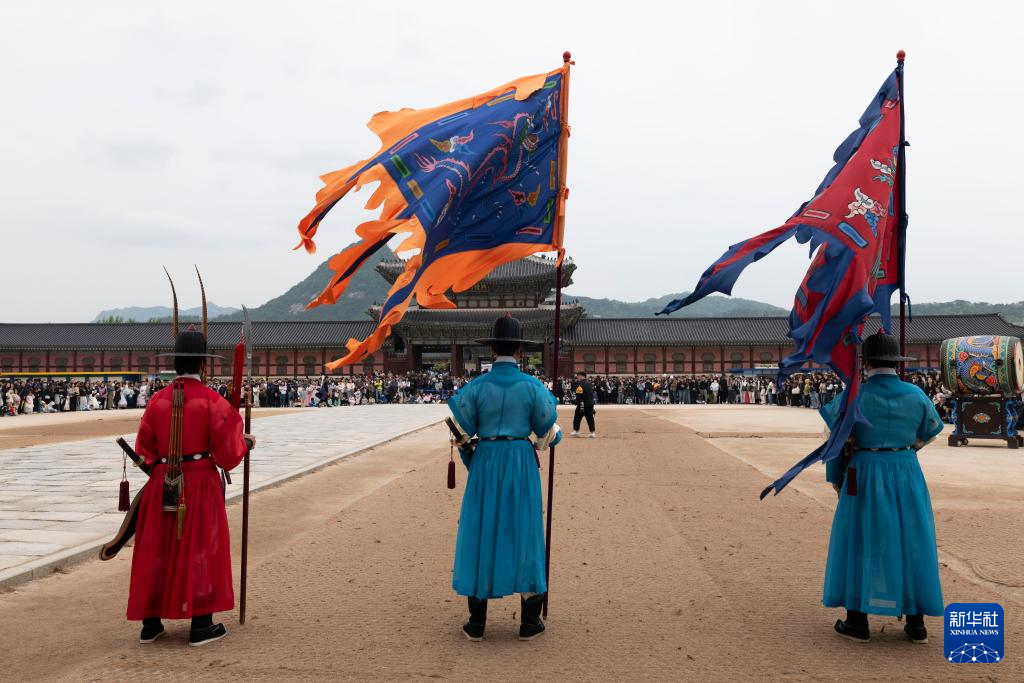 5月5日,游客在韩国首尔的景福宫观看文化表演。