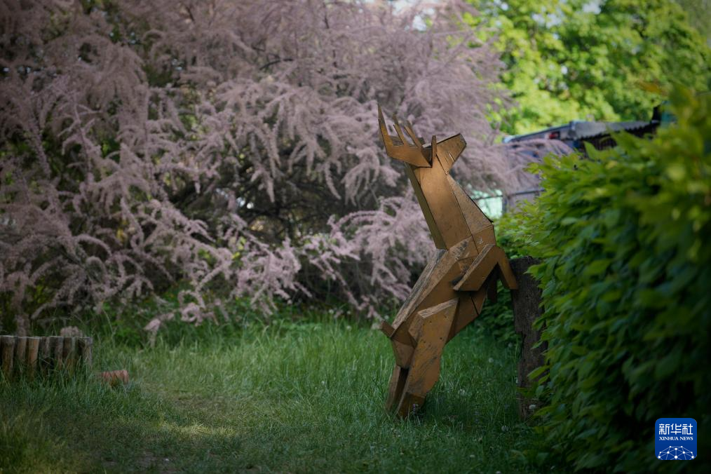 这是5月6日在波兰首都华沙拍摄的麋鹿雕塑。