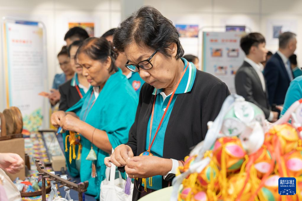 5月16日,老挝民众在首都万象举行的“茶和天下·雅集”暨广西文化旅游推介会上参加壮锦非遗体验活动。