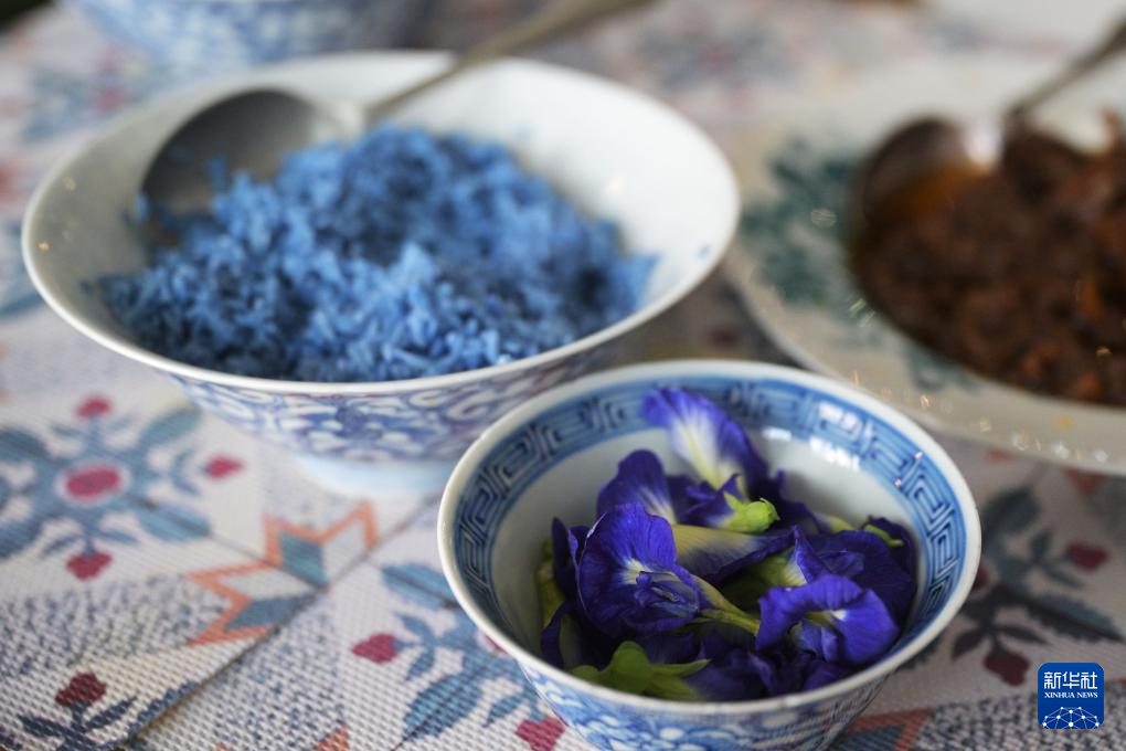 这是5月20日在新加坡娘惹博物馆拍摄的制作娘惹粽的原料:蝶豆花和染色糯米。